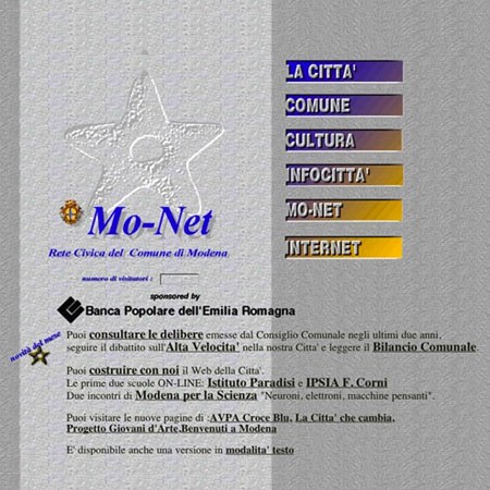 Dopo pochi mesi dalla sua inaugurazione, l’interfaccia della Rete Civica Mo-Net viene rivista lasciando sostanzialmente inalterata la struttura di navigazione ma modificando completamente la grafica.